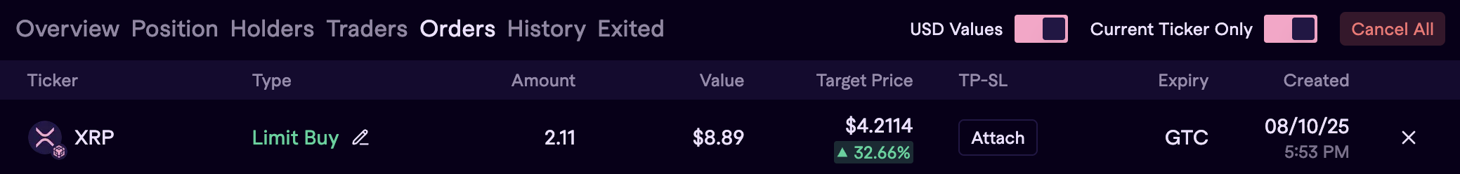 Each entry shows the token, order type, size, value, target price, attached take-profit/stop-loss settings, expiry type (e.g., GTC), creation timestamp, and quick actions to edit or cancel.&#x20;
