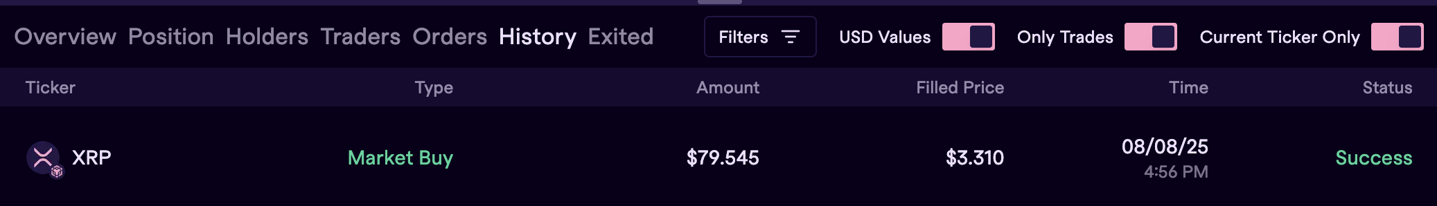The **Closed Orders** section lists completed trades with details on token, type, trade size, filled price, execution time, and final status. Filters allow narrowing results by date, ticker, or trade type, and toggles can switch between USD and token values for clearer performance tracking.